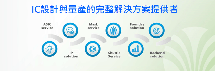 专注于IC设计服务与量产解决方案,提供客户一条龙的便捷式服务,包含ASIC委托设计、晶圆代工、封装测试、光罩代购、IP整合与工程专业咨询,以全面性的整合服务带给客户最便捷的产品生产周期。